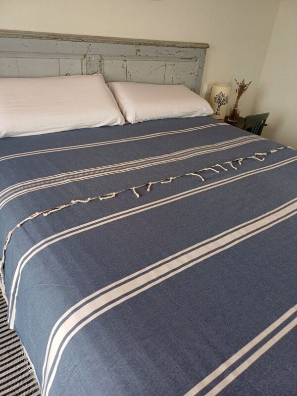 Puedes doblar el Cubrecama Fouta XXL Tavira por la mitad y colocarlo sobre la cama como una decoración atractiva y funcional. Los tonos que ofrecemos se integran perfectamente con la ropa de cama de lino y otros tejidos, creando un ambiente armonioso y elegante.